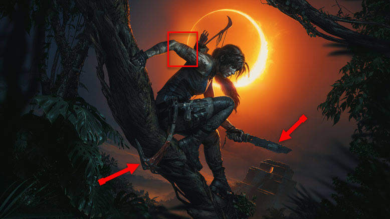 ايضا نرى القوس و الاسهم تحملها لارا على ظهرها و كذلك مسدسها الذي تضعه على جانبها و في الخلفية نرى هناك احد المقابر التي تم تصميمها على شكل هرم و هذا تلميح الى وجود المقابر التي ستكستشفها لارا خلال مغامرتها.