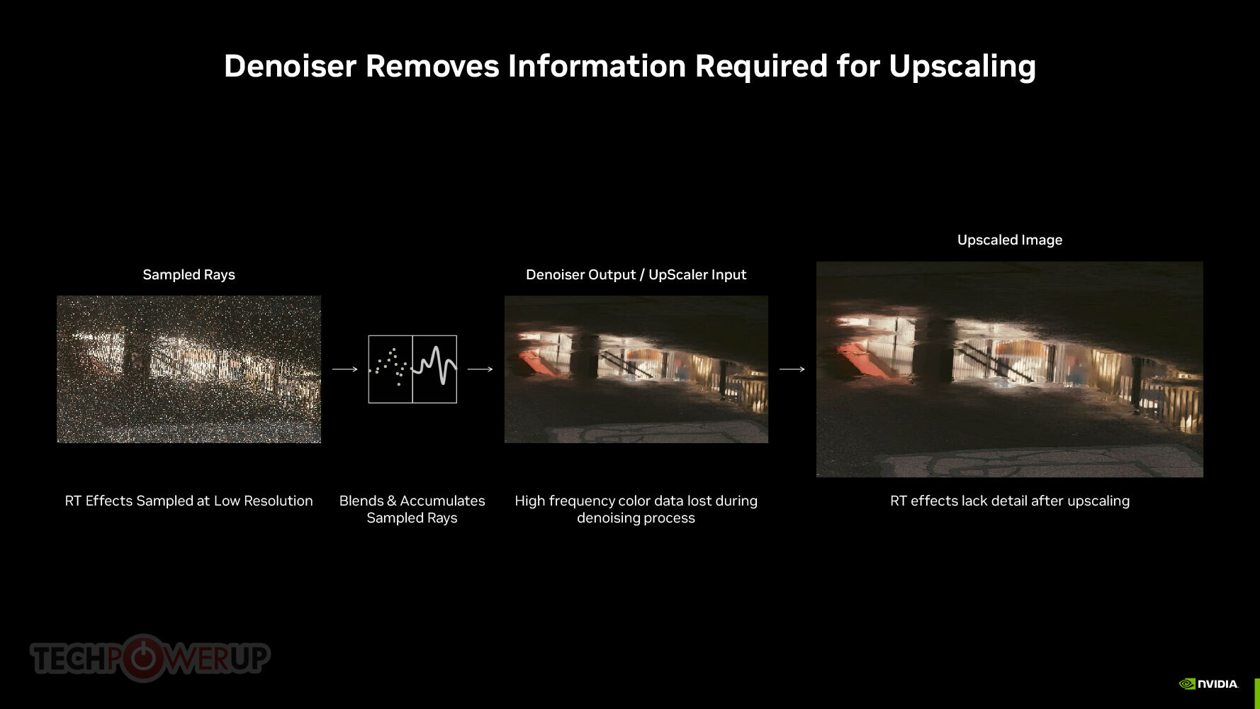 مع تقنية DLSS 3.5، تقدم NVIDIA مزيل ضوضاء جديدًا تم تحسينه للعمل جنبًا إلى جنب مع DLSS 2 upscaling، لتوفير نتائج جودة صورة أفضل وأكثر دقة في نفس الوقت. تعتمد هذه الميزة على Tensor Cores (وليس RT cores)، لذا فهي متوفرة على جميع بطاقات رسومات GeForce RTX الحديثة.
