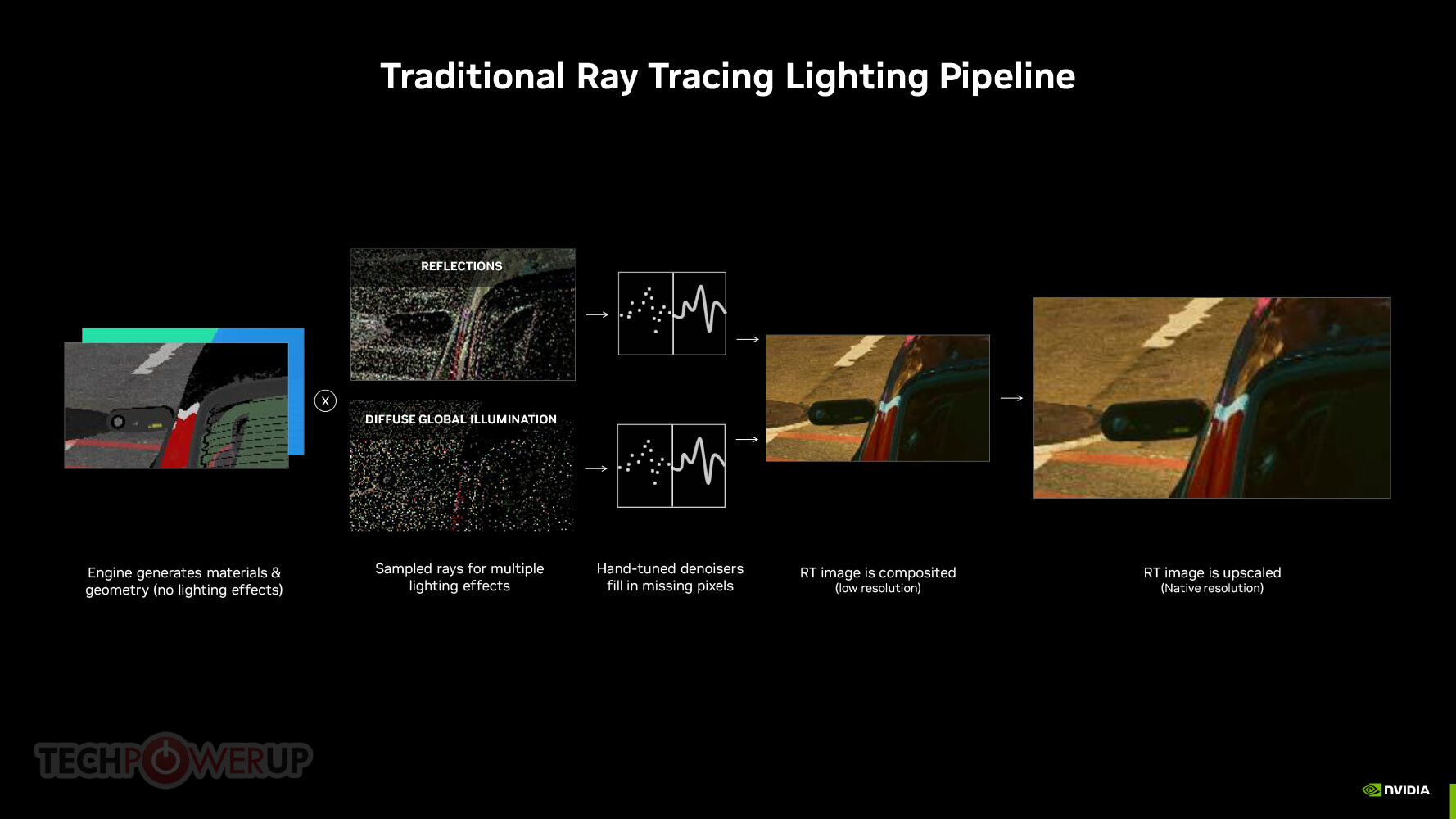 ميزة إعادة البناء الجديدة Ray Reconstruction في نسخة DLSS 3.5 من NVIDIA، تم تصميمها خصيصًا لتحسين مظهر العناصر المُتبعة بتقنية Tracing في الألعاب. بينما تحسب التظليل التقليدي كل بكسل في كل إطار، لا يمكن لتقنية Tracing القيام بذلك لأسباب تتعلق بالأداء.