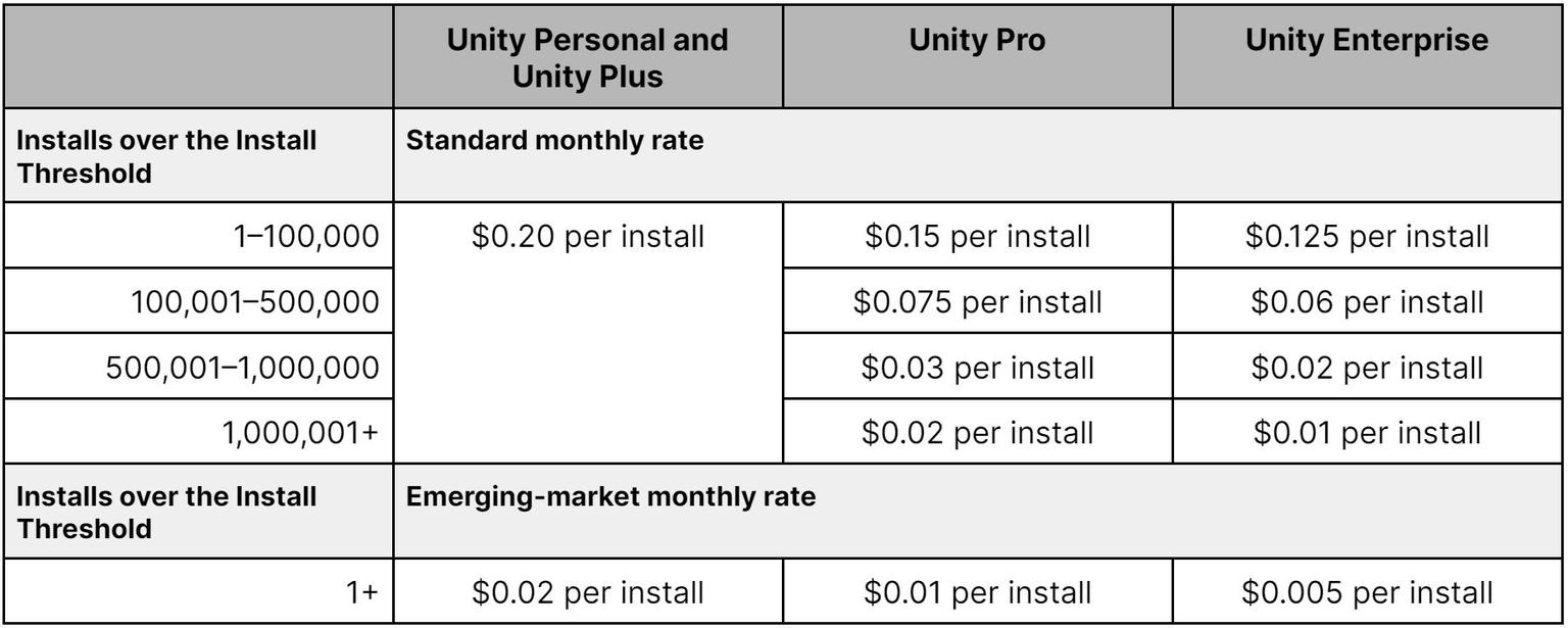 من المعروف أن العديد من شركات تطوير الألعاب الناجحة قامت بتطوير العديد من الألعاب الشهيرة على محرك Unity مثل Rust و Hollo Knight و Pokémon Go، وغيرها الكثير من العناوين. حيث أعلنت الشركة أنه ابتداءً من العام القادم، سيتم أخذ رسومًا إضافية من المطورين على كل عملية تحميل لألعابهم المبنية على ذات المحرك.
