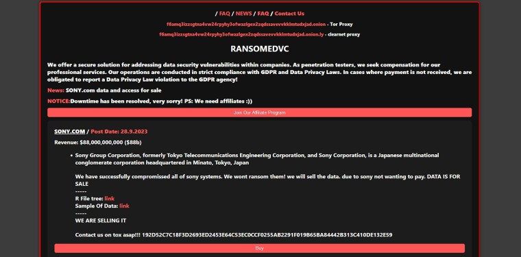 أفادت مجموعة من مطوري برامج الفدية عبر الموقع المذكور، بأنها اخترقت خوادم شركة سوني وتريد بيع البيانات المسروقة من الشركة اليابانية. لكن حتى هذه اللحظة لا يمكننا تأكيد ما إذا كان الهجوم قد تم تنفيذه بالفعل، لكن تقارير Cyber Security Connect تشير إلى أن هذه المجموعة الجديدة، تمكنت سابقًا من اختراق عدد كبير من الضحايا. حيث جاء في بيانها: