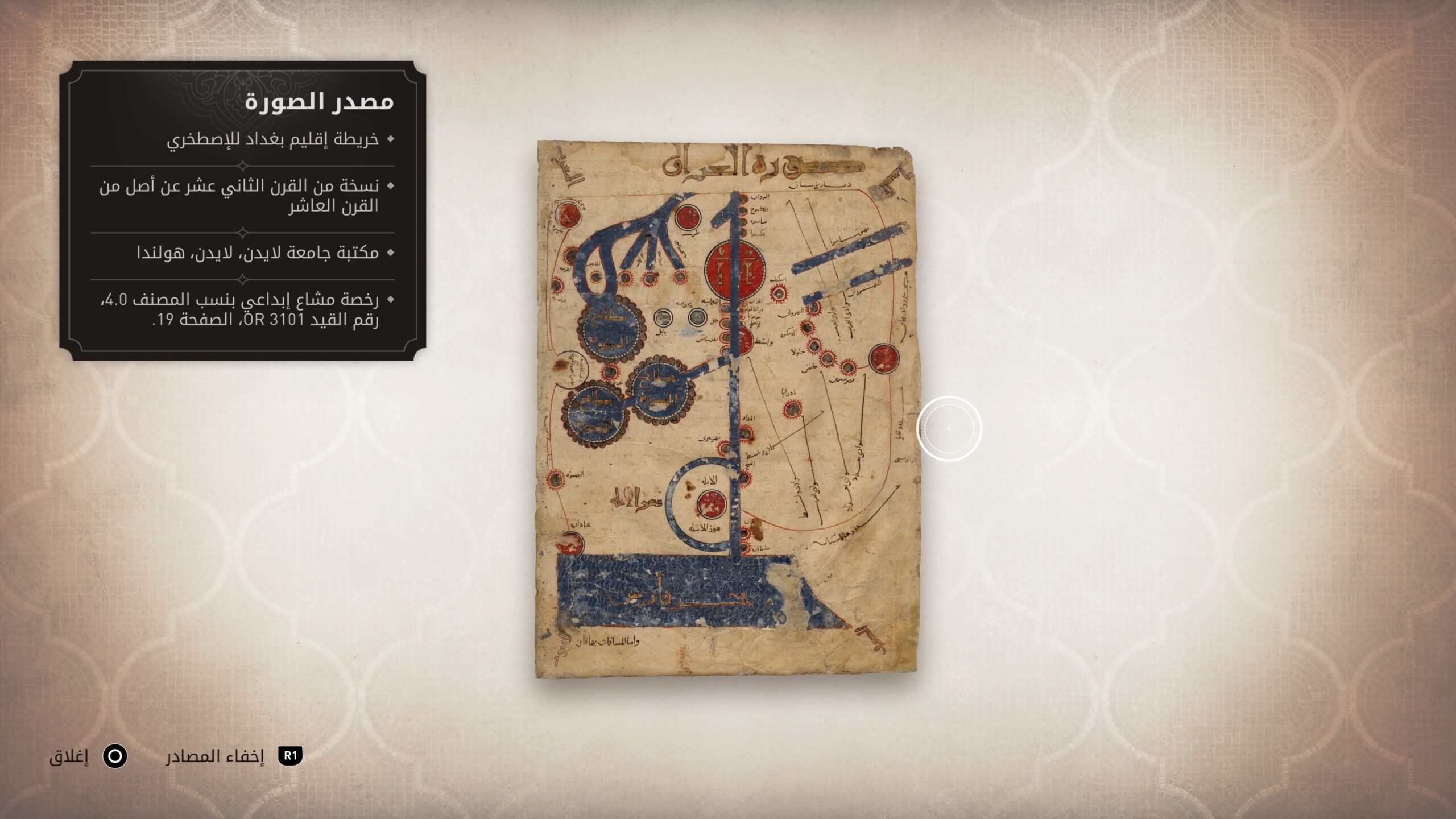 وكما هو موضح في الأسفل، فلدينا مخطوطة تاريخية على اليسار عن خريطة إقليم بغداد للعالم الجغرافي المسلم الإصطخري، وهس نسخة من اقرن الثاني عشر ميلادي.