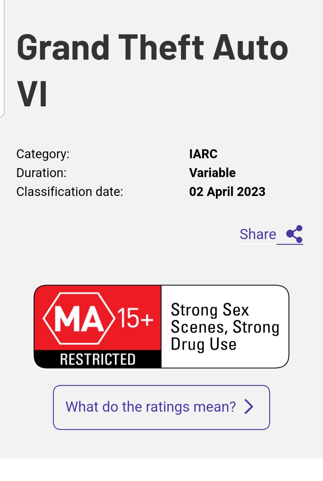 بالنسبة لأولئك الذين لا يعرفون، تم تصنيف GTA V و GTA online عبر نفس الموقع MA18+، وحصلت GTA VI على تصنيف MA15+، وكانت الأسباب هي “المشاهد الجنسية القوية” و”التعاطي القوي للمخدرات”. نذكر أنه قد تم الإبلاغ أن لعبة GTA 6 ستقدم محتويات حساسة بشكل أكبر من أي وقت مضى سواء محتويات غير أخلاقية والمخدرات والعنف.