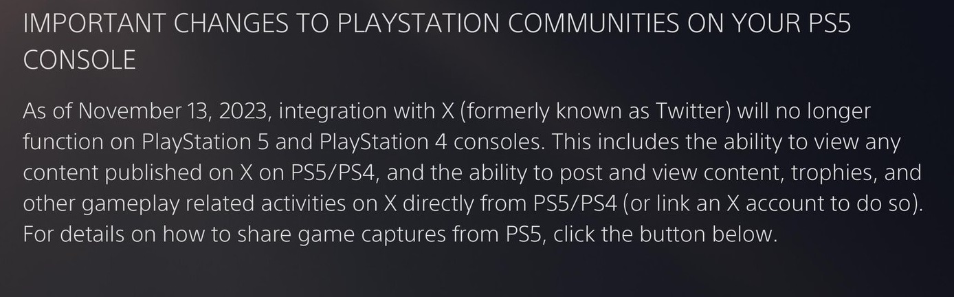 “اعتبارًا من 13 نوفمبر 2023، لن يعد التكامل مع منصة X (المعروف سابقًا باسم Twitter) تعمل على وحدات تحكم PlayStation 5 وPlayStation 4. يتضمن ذلك القدرة على عرض أي محتوى منشور على X على PS5/PS4، والقدرة على نشر وعرض المحتوى والجوائز والأنشطة الأخرى المتعلقة باللعب على X مباشرة من PS5/PS4 ( أو ربط حساب X للقيام بذلك).”