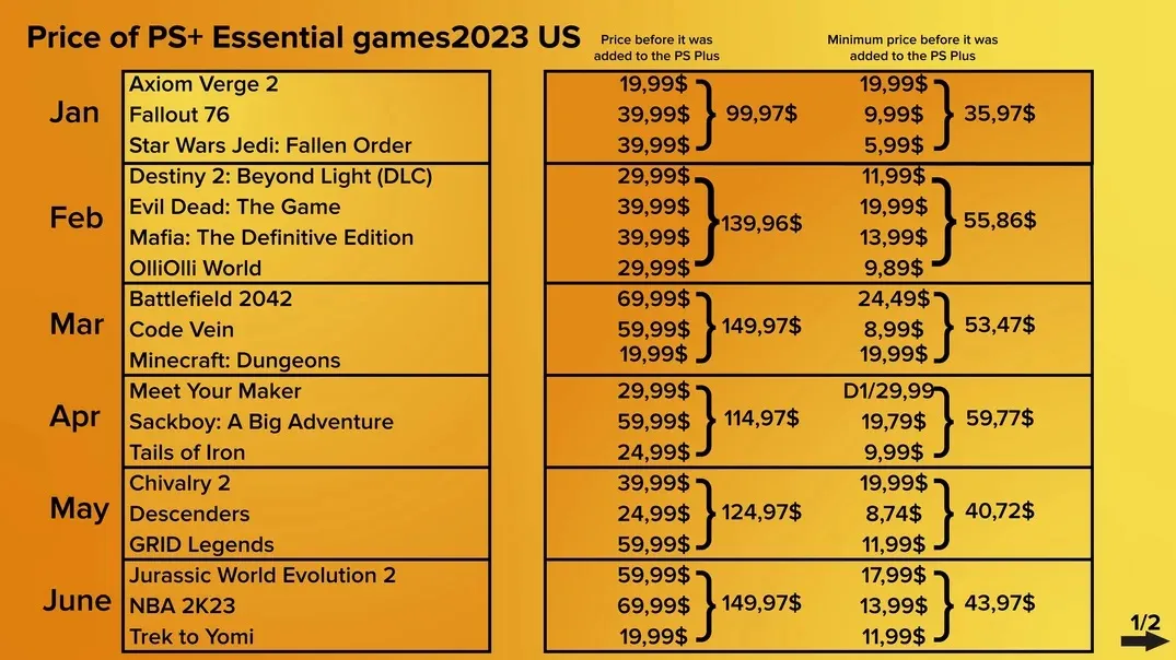 كشف مخطط جديد أنشأه أحد الأشخاص لخدمة PS Plus Essential في عام 2023، قيمة الألعاب المقدمة في متجر الولايات المتحدة وأوروبا ويقارن أسعارها قبل إضافتها إلى خدمة PS Plus على متجر بلايستيشن.