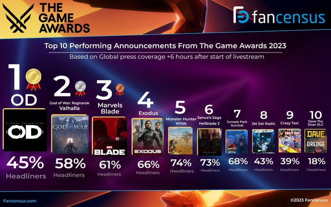 وفقًا لإحصائيات Fancensus، كانت لعبة OD هي الأكثر متابعة بين اللاعبين في حفل جوائز الألعاب المنصرم The Game Awards 2023، حيث كانت نسبة تصدرها للأخبار ومتابعتها بين اللاعبين مقارنةً بالعناوين الأخرى التي تواجدت في الحفل قرابة 45%.