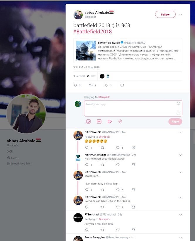 الغريب في الامر ان حساب عباس تتابعة EA بمعظم حساباتها الرسمية و لكن لا ندري ما هي علاقته بهم و هل هو احد اعضاء الشركة او ربما ضمن فريق التطوير في استيديو DICE هذا ما لا نعلمه, اما الشيء الاخر هو ان عباس قام بعد اقل من ساعة بحذف التغريدة و اغلاق حسابه بالكامل و هذا الامر يثير الشكوك ايضا.