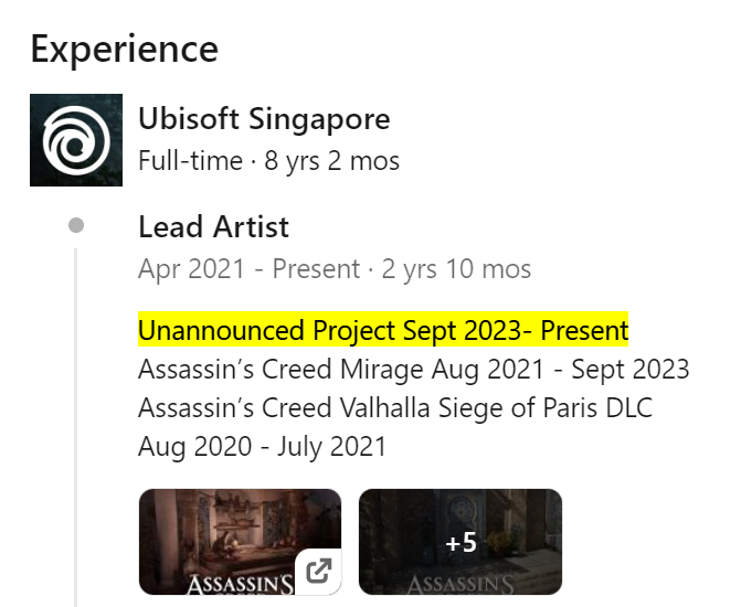 نقلًا عن أحد المستخدمين من موقع إكس والذي رصد وجود مشروع غير معلن من سلسلة Assassin’s Creed تحت التطوير قد بدأه فريق Ubisoft Singapore الذي سيطلق لعبته القادمة Skull & Bones كما نشاهد عبر صفحته الخاصة في موقع LinkedIn.