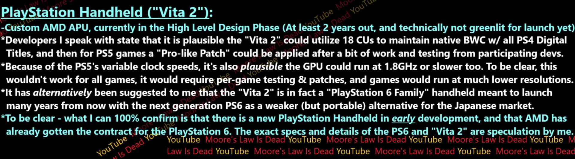 من المنطقي للغاية أن لا تكتفي شركة سوني بجهاز محمول مخصص للبث فقط، حيث وبحسب المطلع Moore’s Law is Dead على قناته الرسمية على يوتيوب، أكد أن مصادره الخاصة من شركة AMD أكدت له أن سوني بدأت بالفعل العمل مع الشركة من أجل تطوير جهاز بلايستيشن محمول جديد يمكن أن يكون PlayStation Vita 2، ومتوافق وقادر على تشغيل ألعاب PS5 و PS4، وسيكون من عائلة الجيل المقبل PS6، أي أنه قد يصدر بعد عدة سنوات من الآن.