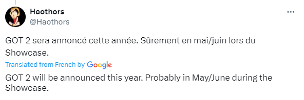 وفقًا للمسرب Haowthors الذي نجح قبل ذلك بتسريب مواصفات تشغيل Horizon Forbidden West على الحاسب، زعم فيها أن هناك أمران هامين سيحدثان خلال فترة قصيرة، الأمر الأول بحسب تغريدة نشرها نقلًا عن منتدى Resetera سيتم الإعلان عن Ghost of Tsushima 2 هذا العام وبالتحديد في شهر مايو القادم أو يونيو خلال حدث PlayStation Showcase الذي يشاع أنه سيعود بنسخة جديدة هذا العام من سوني.