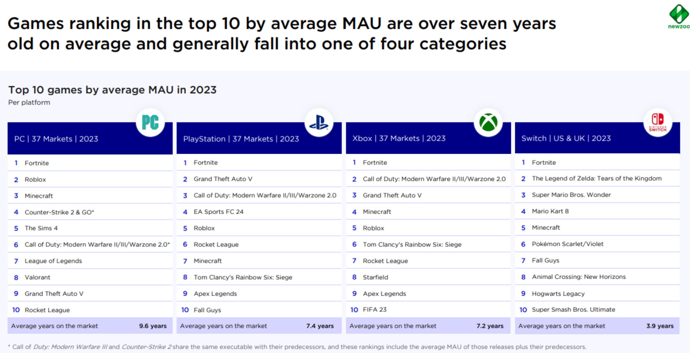 يشير Newzoo إلى أن هذه النتائج تظهر أن الألعاب القديمة لا تزال تتمتع بشعبية كبيرة، حتى مع إصدار ألعاب جديدة ضخمة، ويمكن أن تعزى هذه الشعبية إلى عوامل مختلفة، مثل القيمة المتكررة للألعاب القديمة، والارتباط العاطفي للاعبين بها، والقدرة على اللعب مع الأصدقاء الذين يملكون نفس اللعبة.