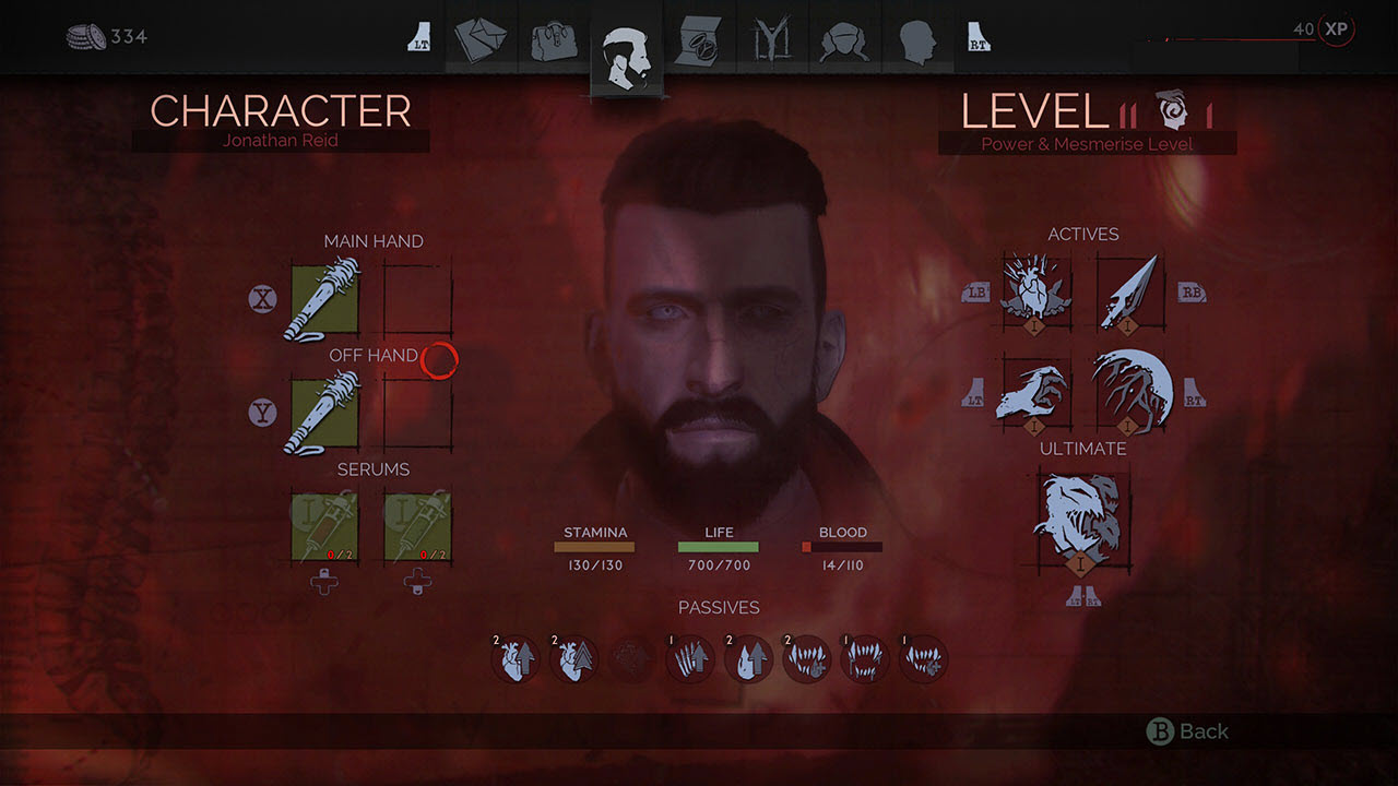 القدرات يمكن تطويرها فقط باستخدام نقاط XP التي تحصل عليها من قتلك للاعداء او اتمامك للمهمات بينما شحن هذه القدرات خصوصا تلك الخاصة بـ Vampire فعليك امتصاص الدماء و فكرة جمع الدماء هنا سيكون له ايضا مغامرتها الخاصة حيث سيكون بالامكان امتصاص دماء المارة العادين الذين يمكنك الاقتراب منهم و تفحص صحتهم باستخدام Vampiric Vision و الذي سيظهر لك الوضع الصحي لكل شخص تراه امامك او يقع في مجالك و بناء عليه يمكنك ان تقرر و لكن يمكنك في اللعبة و كما فعلت انا ان تتجنب امتصاص دماء الناس العادين و الاعتماد على الجرذان و اعدائك الذين يواجهوك في الطريق من اجل امتصاص دمائهم.