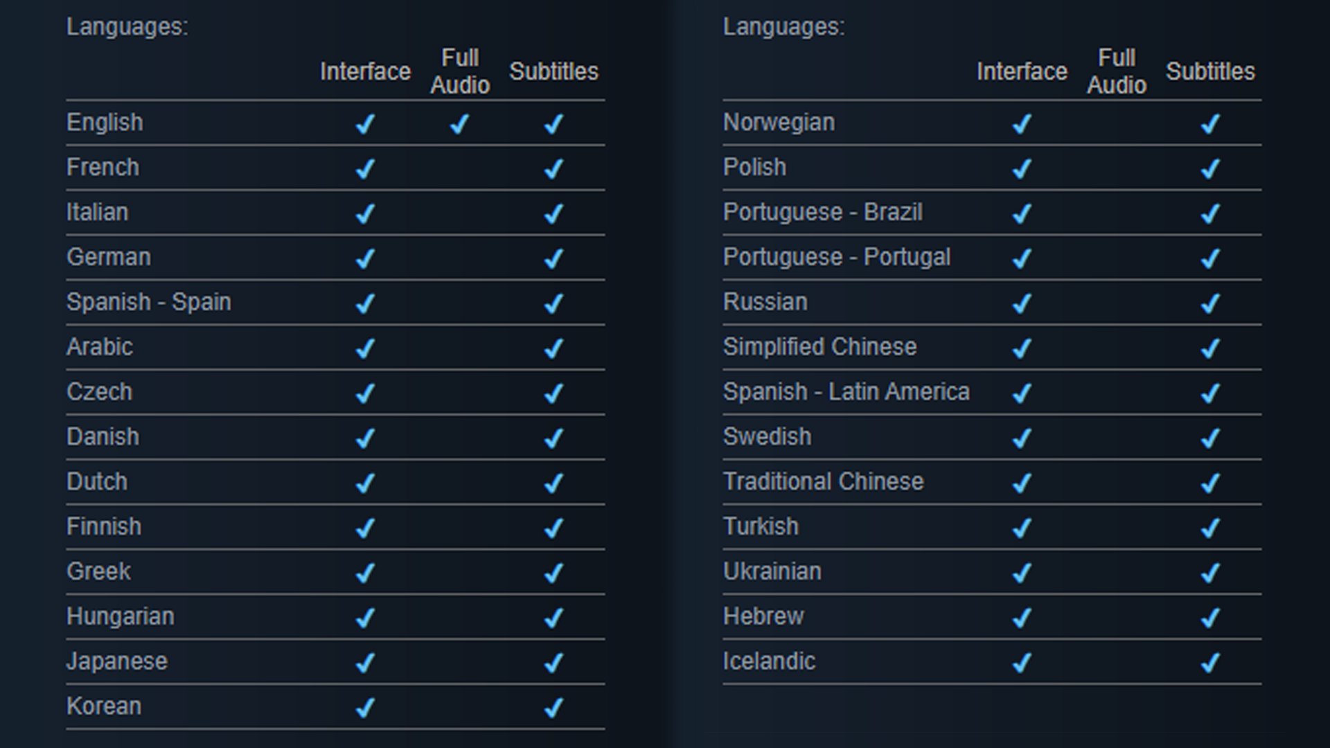 كما أسلفنا ومن خلال تغريدة نشرها الفريق، تم الكشف عن تحديث القوائم اللغات المدعومة للعبة عبر Steam، حيث صرح الفريق بأنه أضاف دعم للغة جديدة وهي الآيسلندية وشاهدنا من خلال القوائم المنشورة أن اللغة العربية من ضمن اللغات المدعومة في اللعبة مترجمة للقوائم والنصوص والحوارات كما نلاحظ أدناه.