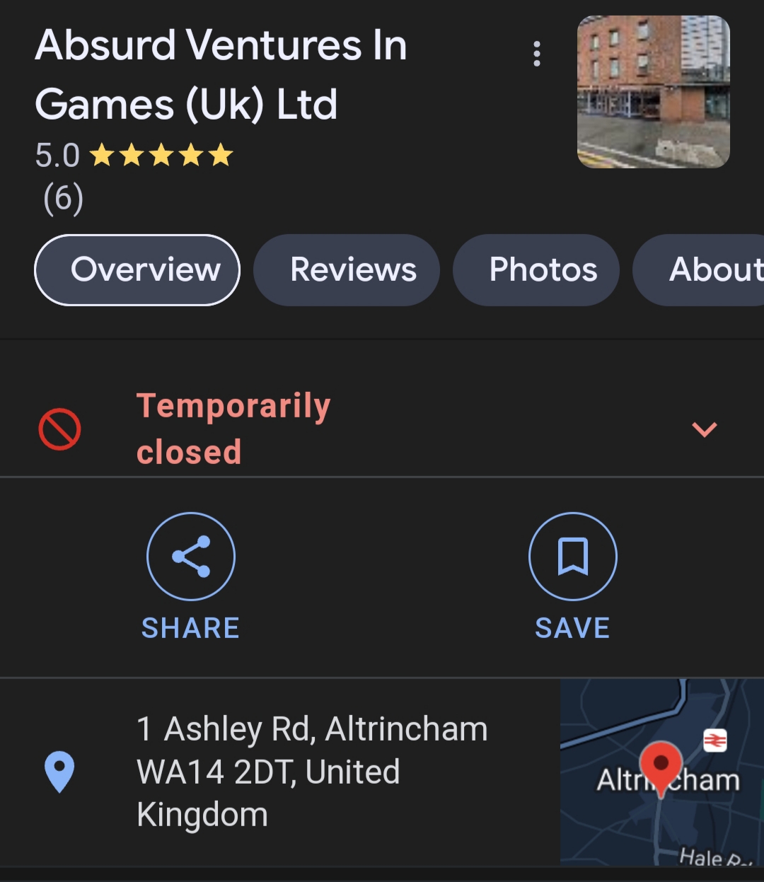 عندما قمنا في فريق VGA4A بالبحث عن أستوديو Absurd Ventures الذي أسسه المطور السابق لسلسلة GTA، وجدنا أن الأستوديو قد تم إغلاقه بشكل مؤقت بدون معرفة الاسباب، بحسب ما هو مذكور عند البحث عن الفريق في محرك البحث Google كما نشاهد أدناه.