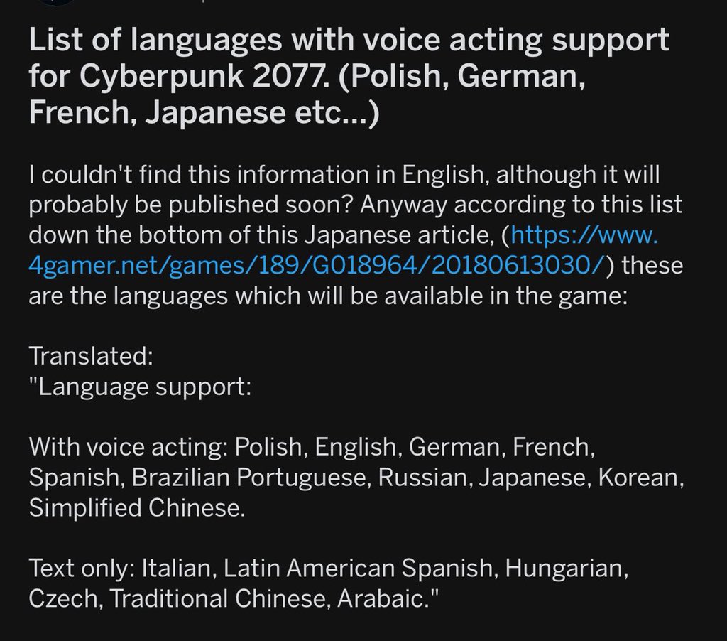 الصورة تحتوي على اللغات التي ستترجم اليها لعبة Cyberpunk 2077 ترجمة نصية و حوارات, و ذكر في الموقع أيضا ان لعبة Red Dead Redemption 2 سيتم ترجمتها الى عدة لغات ترجمة نصية بما فيها الحوارات لكن للاسف اللغة العربية لم تأخذ نصيب الاسد انما سيتم ترجمة اللعبة فقط نصيا كما تم تأكيد ذلك ايضا بالنسبة للعبة Cyberpunk 2077, ما هو رأيكم !!.