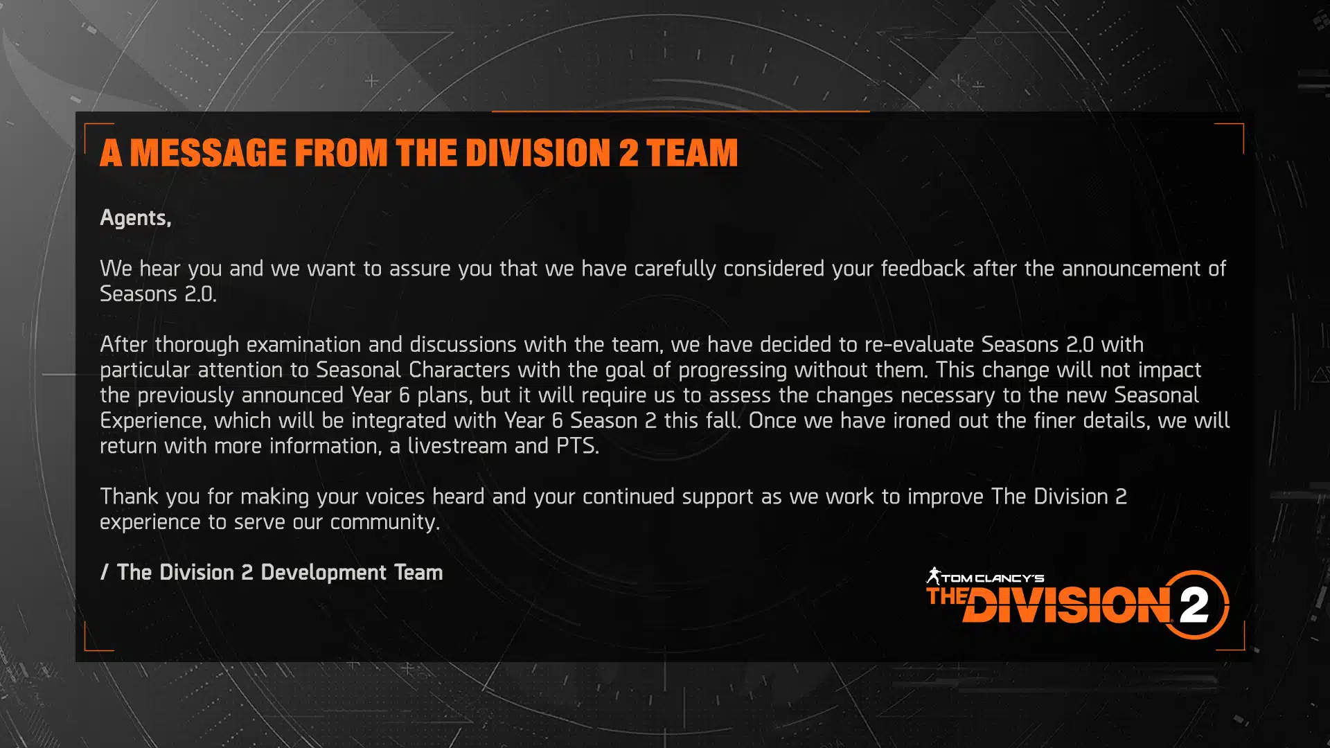 وبعد دراسة متأنية ومناقشات مع الفريق، قررنا إعادة تقييم التغييرات المخطط لها في الموسم الثاني مع التركيز بشكل خاص على الشخصيات الموسمية بهدف التقدم بدونها. لن يؤثر هذا التغيير على خطط السنة السادسة التي تم الإعلان عنها سابقًا، ولكنه سيتطلب منا تقييم التغييرات اللازمة لتجربة الموسم الجديد، والتي سيتم دمجها مع الموسم الثاني من السنة السادسة في الخريف القادم. وبمجرد الانتهاء من التفاصيل الدقيقة، سنعود بمزيد من المعلومات و بث مباشر و PTS.