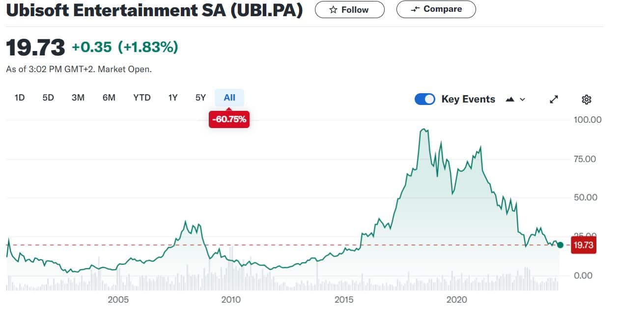أثار التقرير المالي الأخير للناشر الفرنسي شركة Ubisoft عاصفة من المتاعب أسفرت عن خسائر فادحة للغاية، حيث انخفضت أسهم الشركة بنسبة 14% بعد نشر التقرير، ليتم تداولها عند سعر متدنٍ بلغ 19.38 يورو للسهم الواحد.