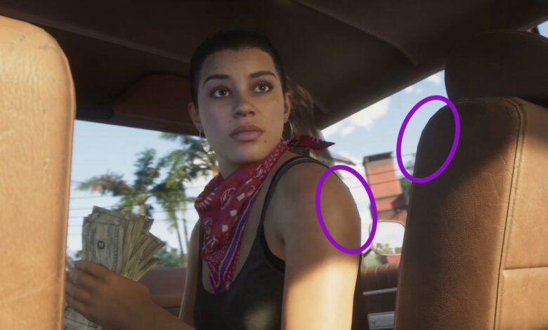 لقطة اخرى من الفيديو يظهر ان روكستار لم تستخدم مضلعات “Polygons” بالشكل الكافي لاعطاء جسد لوسيا الشكل الانسيابي الواقعي. بينما ايضاً يتكرر نفس الخطأ في مشهد “رودي” الذي يقود السيارة الخضراء حيث تم استخدام عدد اقل من المضلعات لتصميم الشخصية.