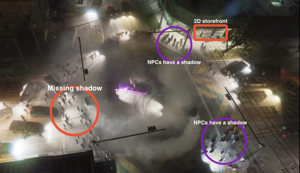 ايضاً هنا اخطأ تقنية اخرى ظهرت في مشاهد متنوعة من عرض GTA 6 الاول، منها ما يتعلق بالانعكاسات التي لم يتم تطبيقها على جميع المجسمات التي تظهر في الشاشة وتم اقتصارها على تلك القريبة بينما المجسمات البعيدة تبقى دون اي انعكاسات.