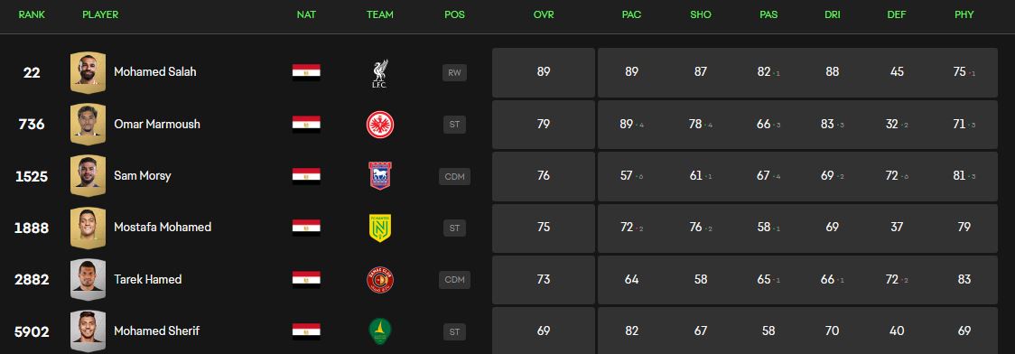بالطبع وبدون اي شك، سيكون على رأس قائمة اللاعبين المصريين اللاعب العالمي محمد صلاح نجم نادي ليفربول، ويليه في التقييم عمر مرموش الذي سيلعب مع نادي فرانكفورت، ومن ثم وسام مرسي مع نادي ابسويتش تاون ومصطفى محمد مع نادي نانت وطارق حامد مع نادي ضمك واخيراً محمد شريف مع الخليج. واليكم هنا تقييمات هؤلاء اللاعبين في اللعبة.