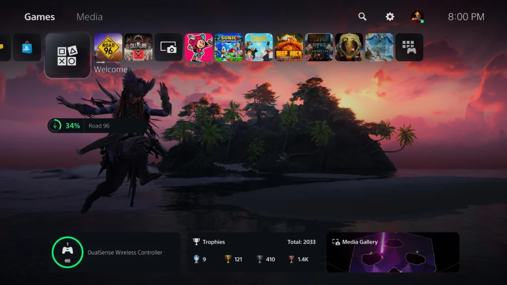 كما تشاهدون في الصورة بالاسفل، وبعد الخروج من عملية الاعداد، ستصبح العناصر الثلاثة التي اخترتها مرتبة جنباً الى جنب في اسفل الشاشة مما يمنع شاشة البداية لجهاز PS5 مظهر اكثر وضوح وظهور. يمكنك الان الاستمتاع بظهور افضل للخلفية التي اخترتها لتطبيق Welcome Hub والتي تظهر على كامل شاشة النظام.