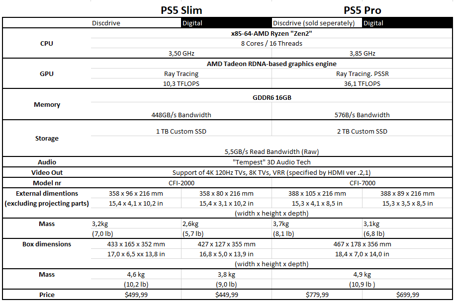 كما هو موضع في جدول المقارنة هذا، جهاز PS5 Pro يتفق مع الطراز العادي في الكثير من المواصفات، هذا لانه مجرد جهاز منتصف جيل وليس جيل جديد. لكن هناك بعد النقاط المحورية التي ما زال الجهاز الجديد يتفوق فيها وستمنحه قوة قد تصل الى ضعف قوة الطراز العادي بشكل عام.