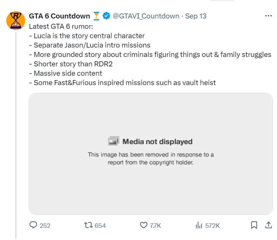 Take Two قامت باصدار انذار حقوق ملكية DMCA ضد حساب GTA 6 Countdown على منصة X وهو احد الحسابات النشطة في تغطية اخبار وتحديثات اللعبة، حيث تم ازالة الصورة الخاصة بالمنشور على المنصة كما تشاهدون في الصورة بالاسفل.