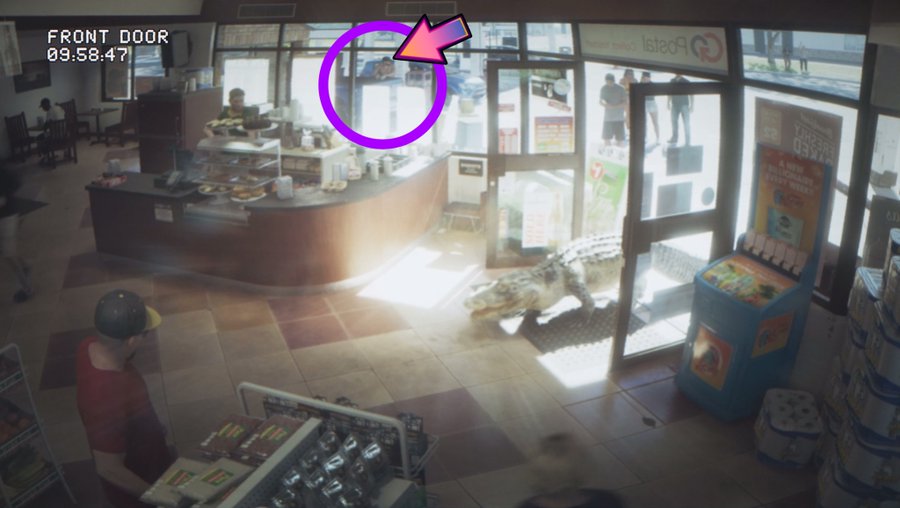 لقطة سريعة لن ينتبه لها الا ذوي النظر الحاد، وذلك بسبب ان الجميع ركز في هذا المشهد انظاره على دخول تمساح الاليغيتور الى السوبر ماركت. لكن اذا انتبهنا الجهة الخارجية من خلال زجاج السوبر ماركت سنرى احد العاملين في محطة الوقود وهي شخصية NPC تقوم بتعبئة مركبة بطل اللعبة بالوقود.