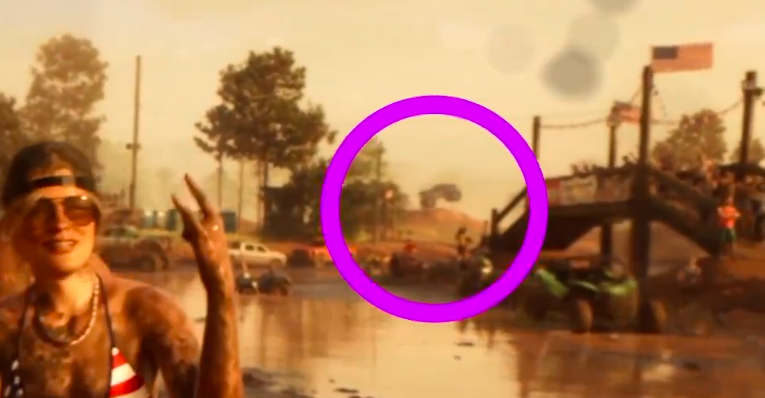 احد المشاهد الذي يأخذنا من خلالها العرض الاول للعبة كان في المنطقة الطينية والتي على ما يبدو سنمارس فيه رياضة مركبات Monster truck المثيرة. ومن خلال احد المشاهد التي حصلنا عليها في العرض الاول تظهر في خلفية الصورة احد المركبات الضخمة Monster truck وهي تنفذ قفزة بهلوانية مرتفعة خلال المنافسة في احد الحلبات.