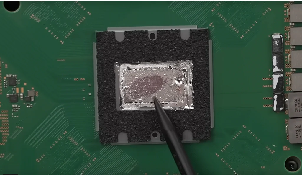 في جهاز PS5 Pro قامت سوني بمعالجة هذه المشكلة من خلال وضع اخاديد دقيقة على شكل خطوط متصلة تغطي سطح وحدة المعالجة. هذه الخطوط تساعد في تثبيت السائل المعدني Liquid Metal في مكانة وتمنع انزلاقه حسب وضعية الجهاز.