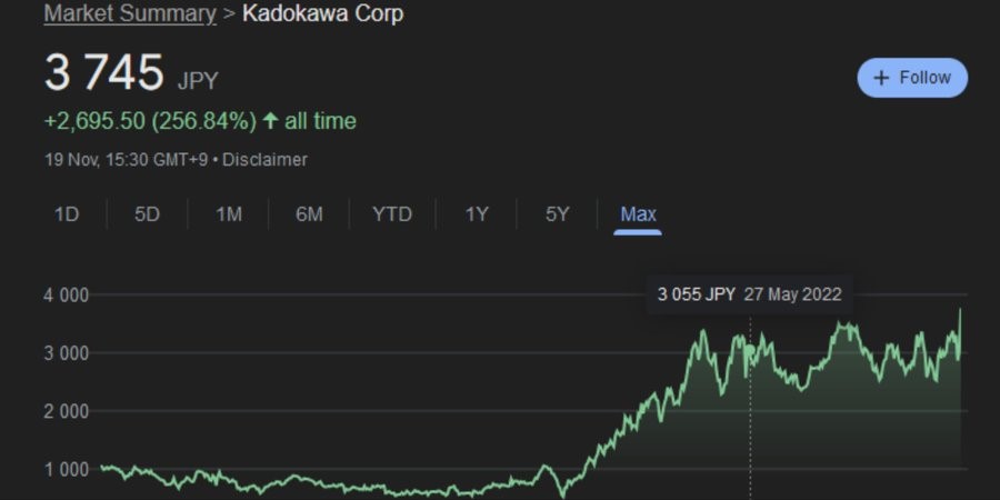 اسهم شركة Kadokawa تقفز الى اعلى مستوياتها بعد تقارير استحواذ سوني عليها
