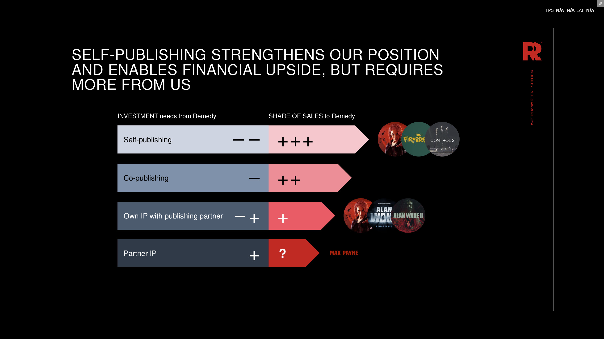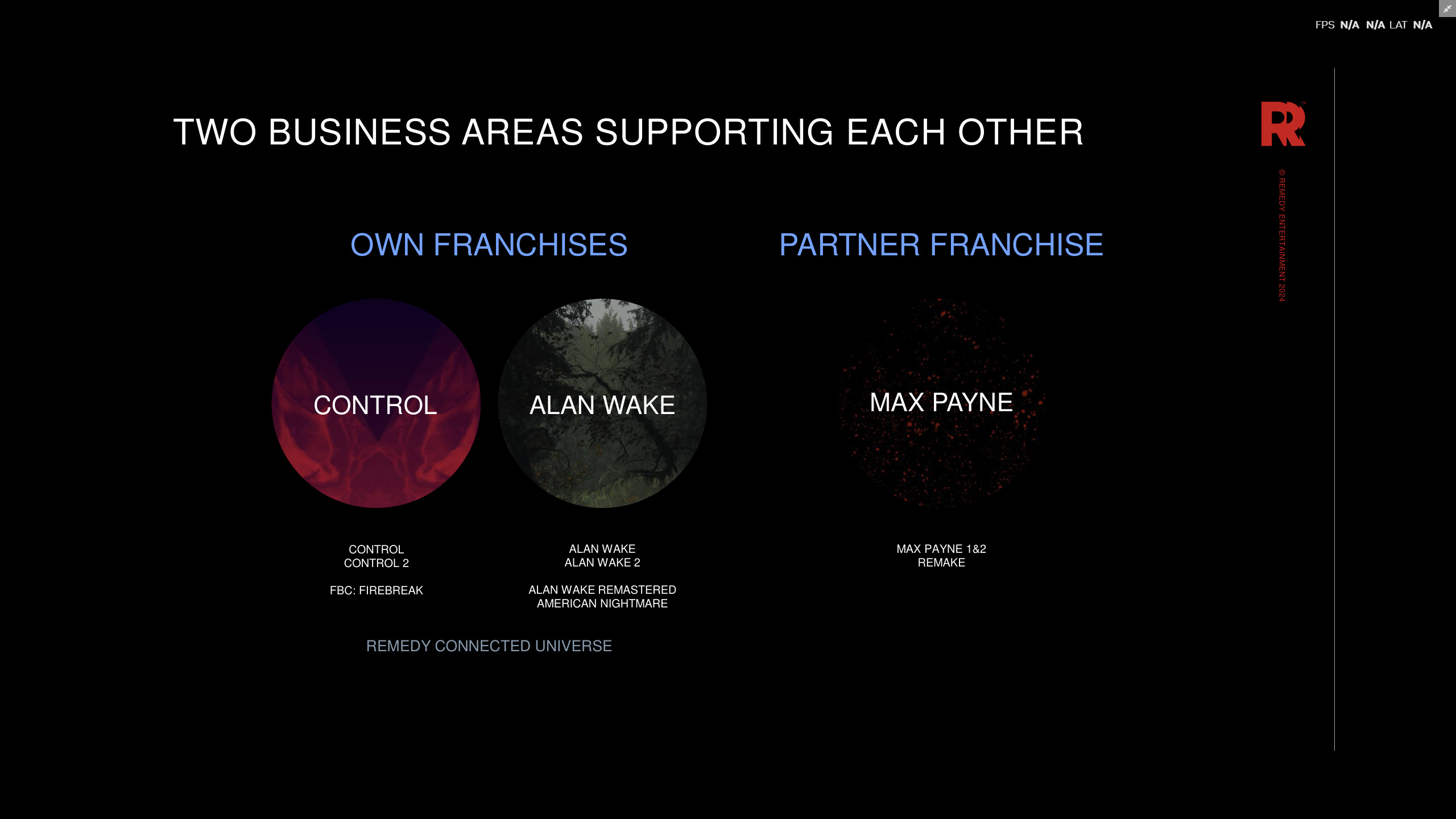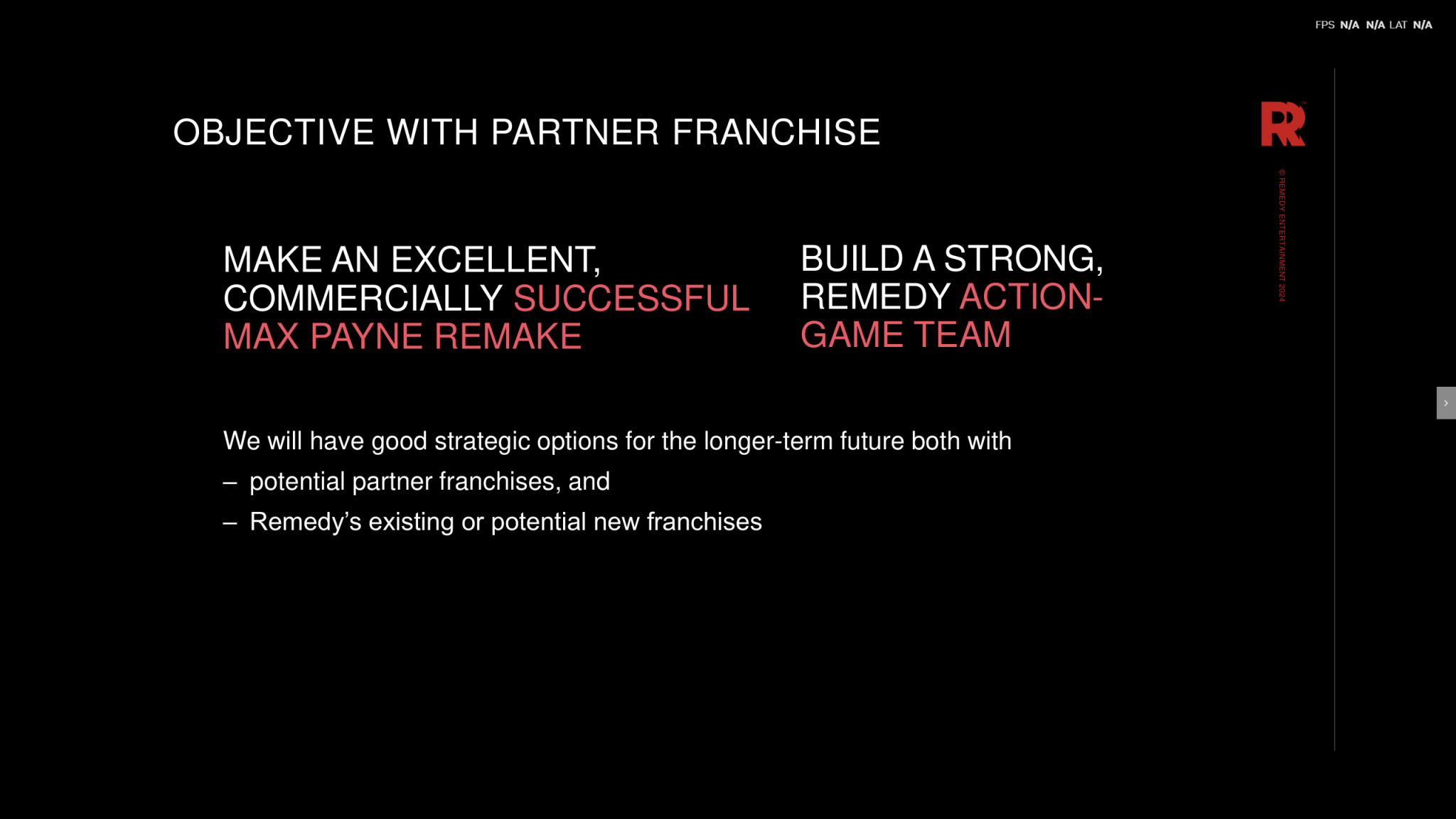 وخلال يوم السوق الرأسمالي لشركة التطوير Remedy لعام 2024 نقلًا عن Rockstarintel، وهو حدث مهم تعقده الشركات بشكل دوري لتقديم معلومات للمستثمرين حول أدائها المالي وخططها المستقبلية، قدم الرئيس التنفيذي للشركة ترو فيرتالا عرضًا تقديميًا حول حالة الشركة ومستقبلها، بما في ذلك تحديثات حول ريميك Max Payne 1 و 2.