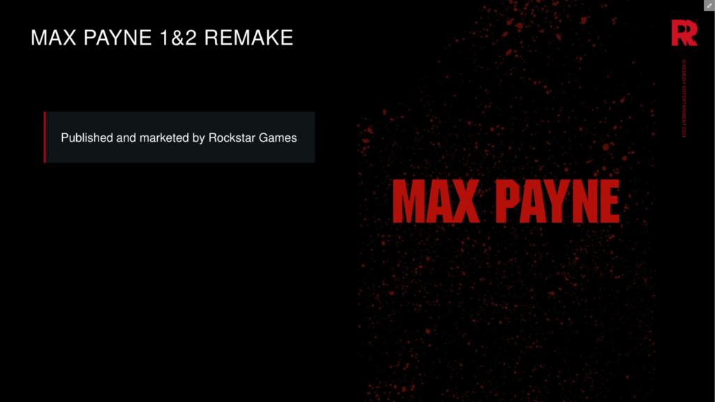 وفي نفس الحدث، شارك مدير العمليات لدى الشركة يوهانس بالوهيمو عرض تقديمي أشار فيه إلى أن روكستار لا تزال تمول وتسوق ريميك Max Payne، كما أظهر الشعار الأسود والأحمر لسلسلة Max Payne.