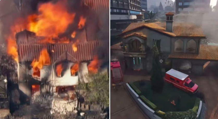 هناك أجزاء كبيرة من مدينة لوس انجلوس في الحياة الواقعية قد تأثرت بهذا الحريق الضخم ويبدو كان له تأثير على جمهور لعبة GTA 5، لكن احد اكثر ما اثار انتباهنا هو احتراق البيت الذي استلهم منه بعض بيوت اللعبة والتي احترق احدها بالفعل في اللعبة كما تشاهدون في الصور التي شاركها بعض المستخدمين.