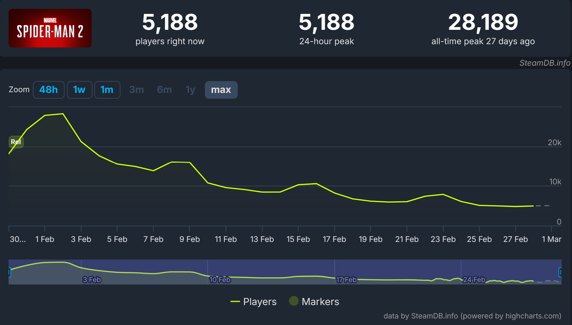 إذا أردنا التحدث بلغة الأرقام، فالوضع على الحاسب لا يبدو ورديًا حتى الآن على الإطلاق، فالأرقام الرسمية لمنصة Steam تُظهر صورة قاتمة نوعًا ما، ففي هذه اللحظة التي نكتب فيها هذه السطور، لا يتجاوز عدد اللاعبين النشطين للعبة Marvel’s Spider-Man 2 على Steam حاجز الـ 5,200 لاعب بقليل (تحديدًا 5,188 لاعب).