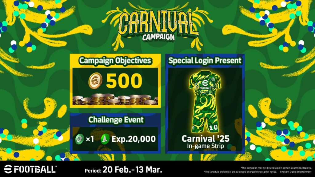 للاحتفال بهذه المناسبة الخاصة، تطلق KONAMI حملة الكرنفال، حيث يمكن للاعبين ربح عملات eFootball™ مجانية ومكافآت حصرية داخل اللعبة.