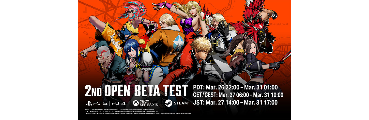 سيتم اجراء الاختبار التجريبي المفتوح الثاني للعبة Fatal Fury: City of the Wolves في محاولة لتحسين التجربة على الإنترنت، وسيتمكن اللاعبون من الاختيار من بين تسع شخصيات بما في ذلك ولأول مرة المقاتل تيزوك وأثناء خوضهم وضع التدريب والمزيد خلال فترة الاختبار.