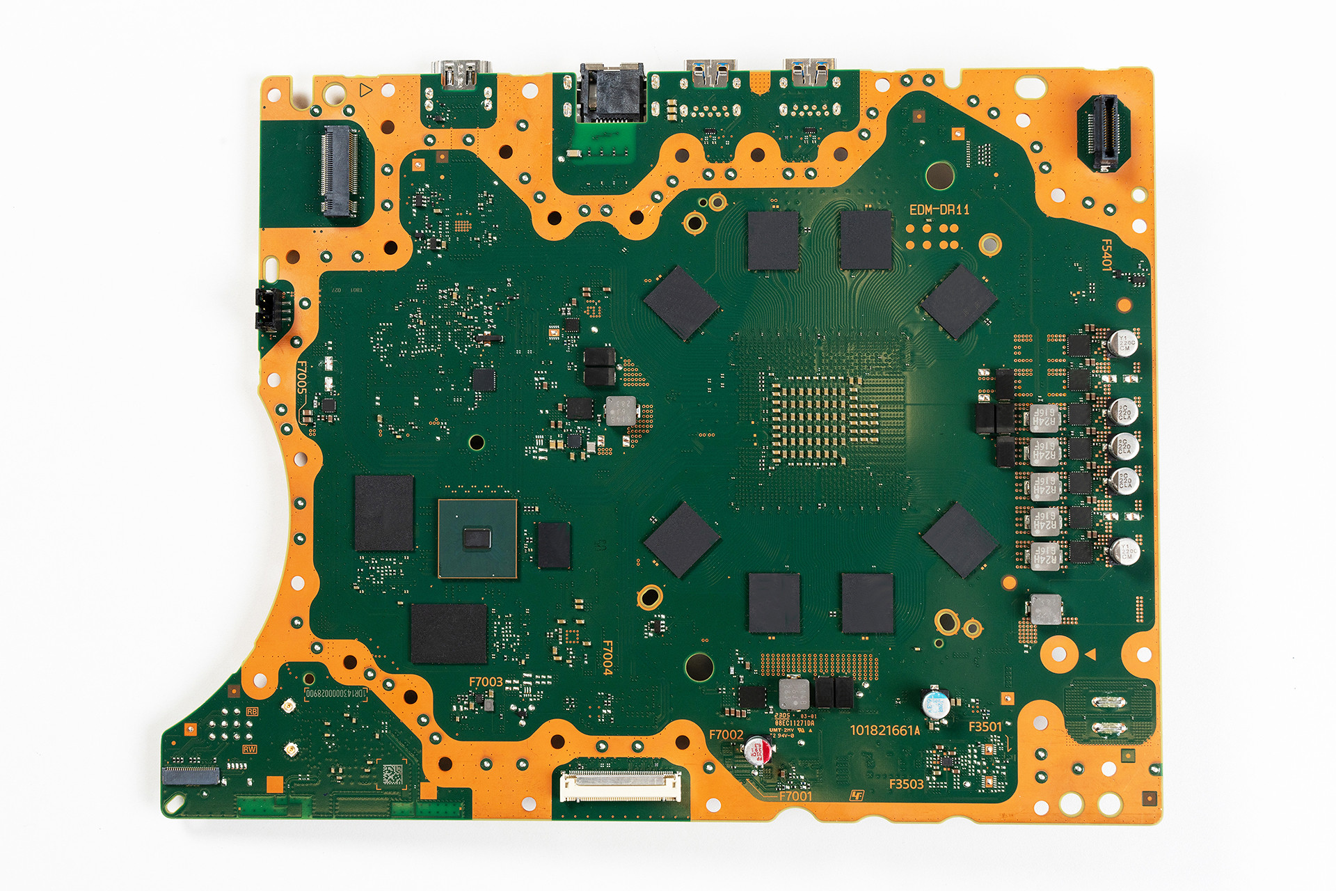 - الذاكرة: زاد عدد شرائح الذاكرة من 8 إلى 9، مع إضافة شريحة DDR5 مخصصة للمهام منخفضة السرعة مثل نظام التشغيل، بينما تعالج 8 شرائح GDDR6 المحسنة المهام عالية السرعة مثل عرض الألعاب.