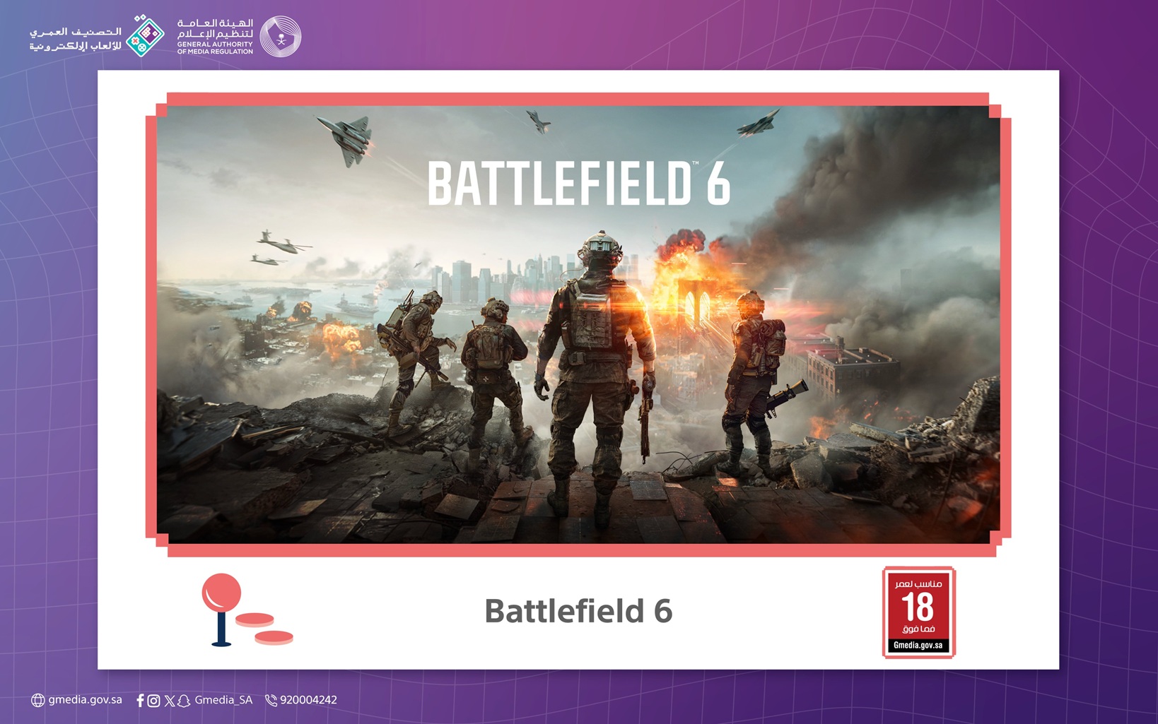 حصلت لعبة التصويب المنتظرة Battlefield 6 على تصنيف عمري رسمي من قبل الهيئة العامة لتنظيم الإعلام في المملكة العربية السعودية، حيث صُنفت اللعبة لتناسب الأعمار 18 عامًا فما فوق، وجاء هذا الإعلان عبر حساب الهيئة الرسمي على منصة اكس “تويتر سابقًا”