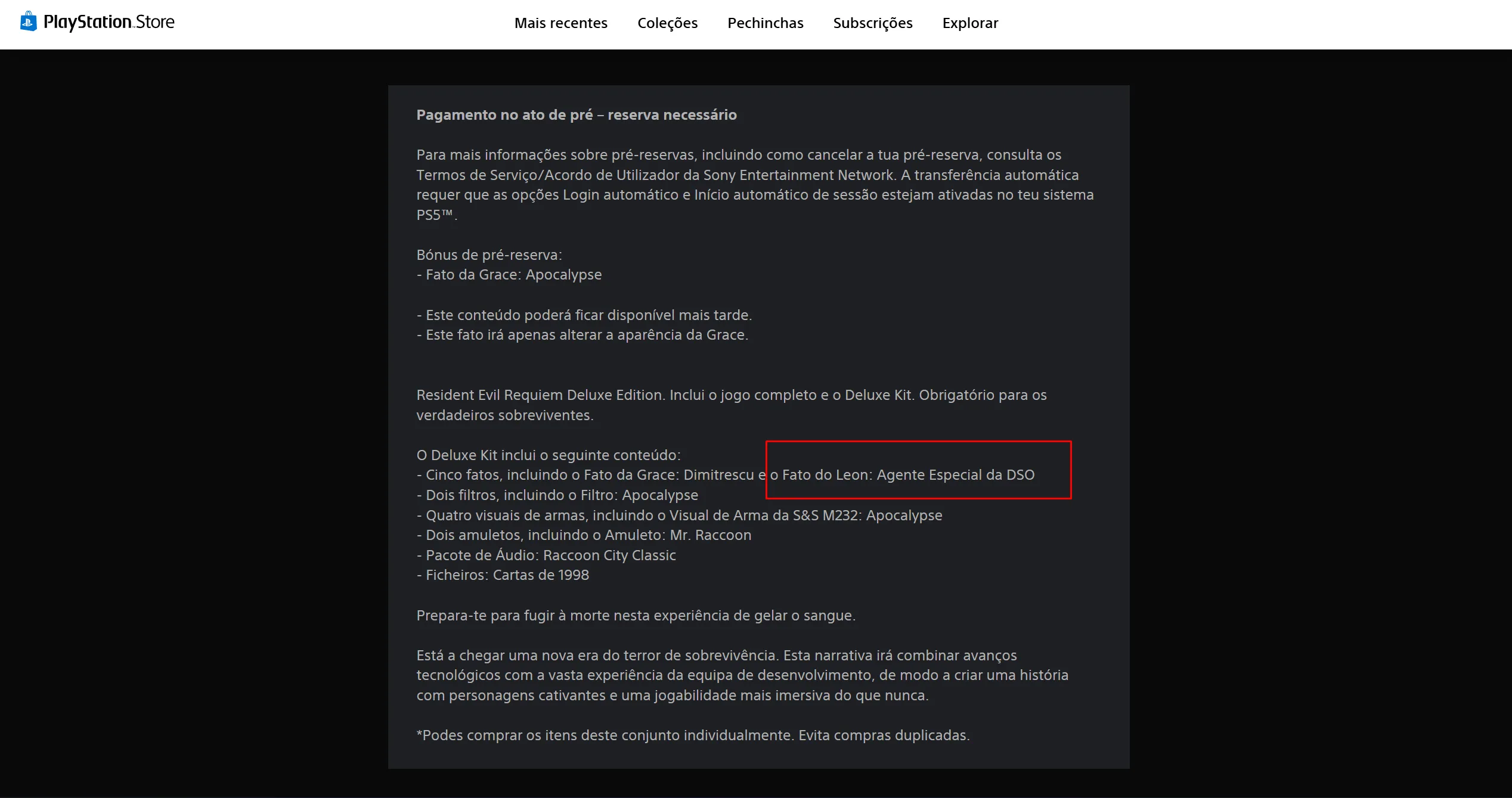 في تسريب مثير يُعتقد أنه من صفحة الطلب المسبق الرسمية للعبة Resident Evil Requiem على متجر بلايستيشن “البرتغالي”، وُجد أن النسخة الفاخرة (Deluxe) تضم زي حصري للشخصية ليون س. كينيدي، ما أثار ضجة بين المعجبين بعد سنوات من التكهنات حول عودته إلى السلسلة.
