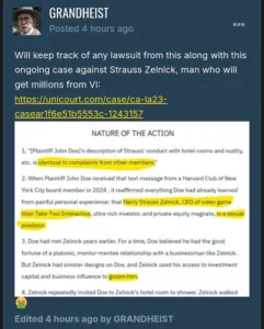 تُظهر الوثائق المرفقة من منصة UniCourt ومنشور على منتديات gtaforums تفاصيل من دعوى قضائية رفعها المدعي جون دو ضد شتراوس زيلنيك، الرئيس التنفيذي لشركة Take-Two Interactive.
