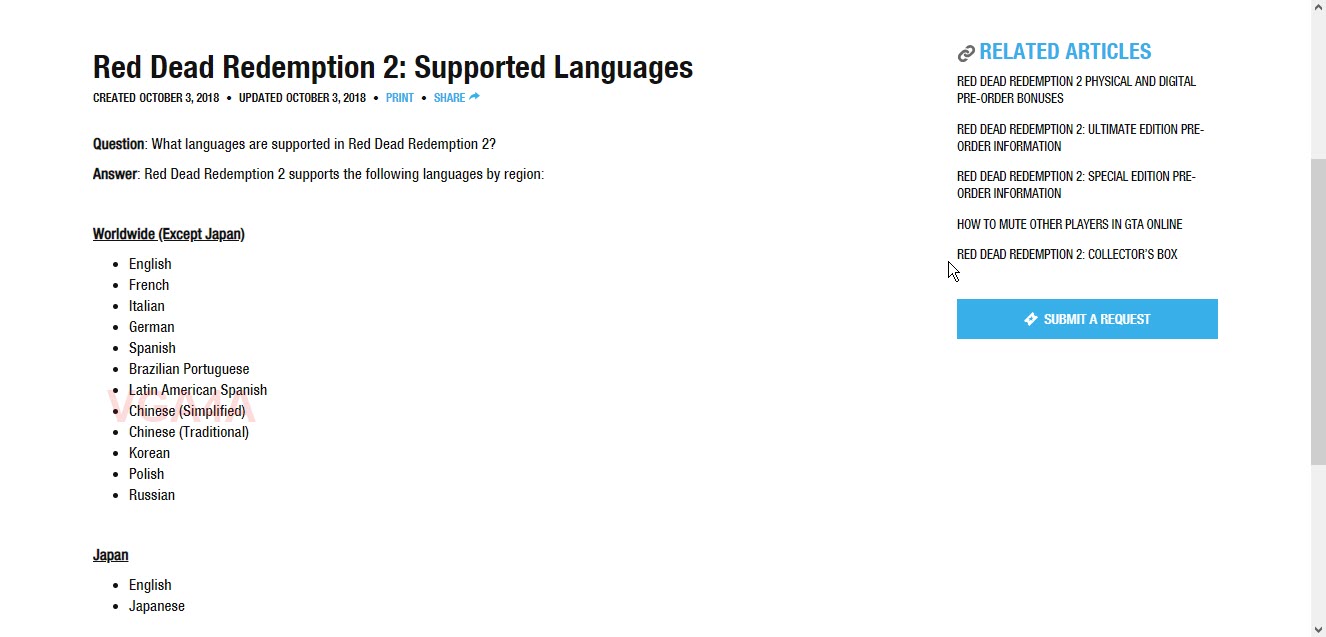كما تشاهدون في الصورة بالاسفل و التي قمت بالتقاطها من صفحة الدعم الخاصة بروكستار حين تم توجيه سؤال الى فريق الدعم حول اللغات التي سيتم دعمها في اللعبة فكان الرد بالكشف عن القائمة الكاملة للغات كما تشاهدون.