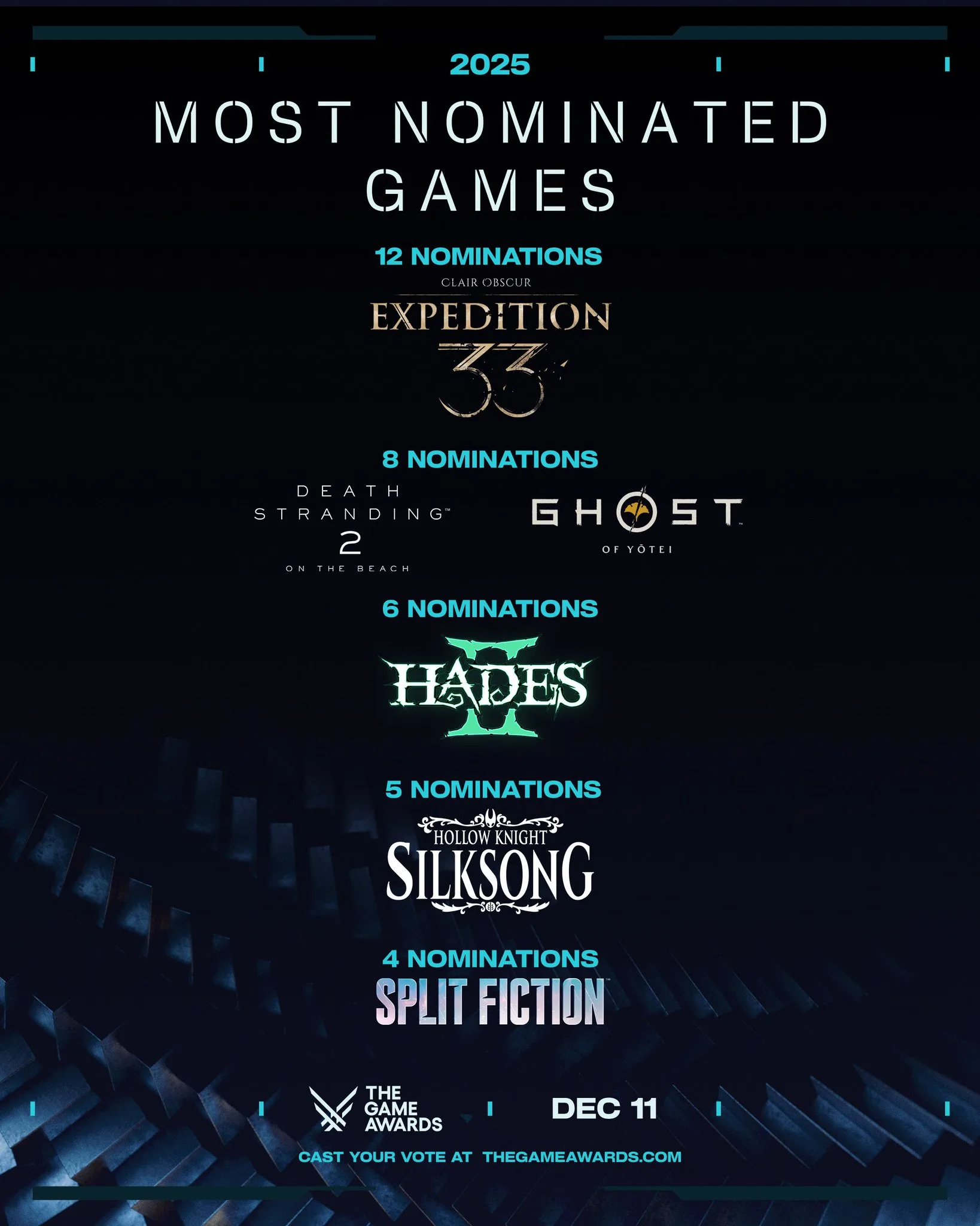 - لعبة Clair Obscure Expedition 33 في المرتبة الأولى حيث ترشحت لقرابة 12 جائزة من بينها جائزة لعبة العام.