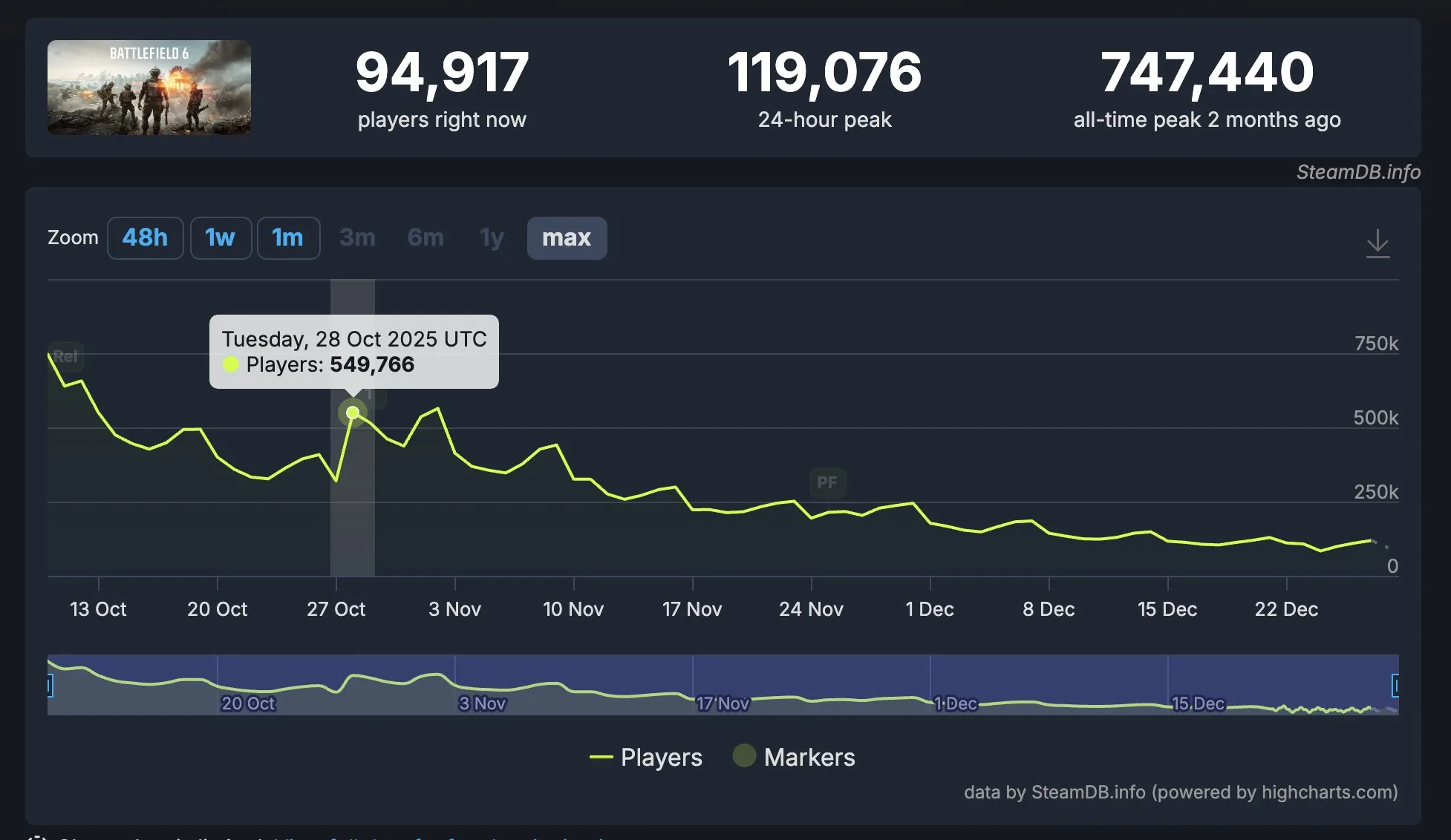 في فترة الإطلاق والموسم الأول، سجلت اللعبة ذروة تجاوزت 550 ألف لاعب متزامن، وهو رقم اعتبر حينها نجاحًا كبيرًا وعودة قوية للسلسلة. لكن مع مرور الوقت، تراجعت الأرقام بشكل واضح، حيث أصبحت الذروة اليومية الحالية تتراوح بين 100 ألف و120 ألف لاعب فقط على Steam، ما يعني خسارة تقارب 80% من قاعدة اللاعبين خلال فترة قصيرة نسبيًا.