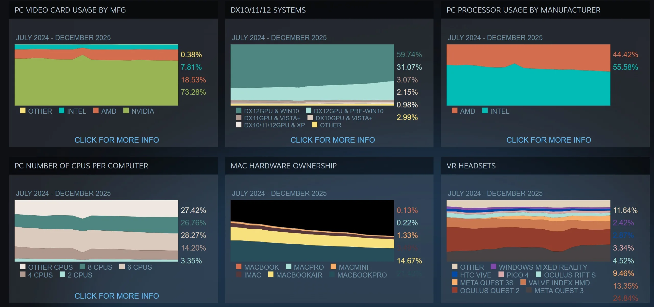 نشر موقع SteamDB إحصاءات محدثة مستندة إلى بيانات Steam Hardware & Software Survey للفترة الممتدة من يوليو 2024 حتى ديسمبر 2025، والتي قدمت صورة دقيقة عن توجهات عتاد لاعبي منصة الحاسب الشخصي على منصة ومتجر Steam.