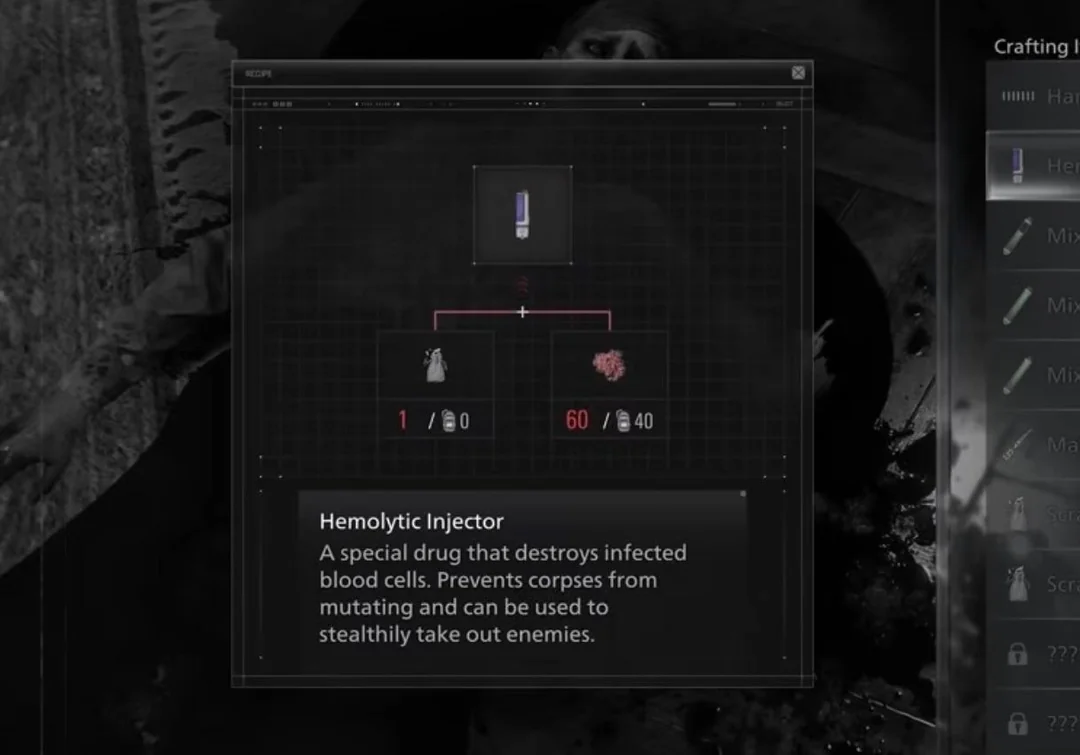 وخلال عرض Resident Evil Requiem Showcase، كشفت كابكوم عن نظام تصنيع مطوّر، كان من بين عناصره أداة تُدعى Hemolytic Injector، والذي وصف الأداة يشير إلى قدرتها على تدمير الخلايا المصابة ومنع تحوّل الجثث، وهي صياغة تفتح باب التأويل، خصوصًا لمن يتذكر آلية Crimson Heads في الإصدارات الكلاسيكية.
