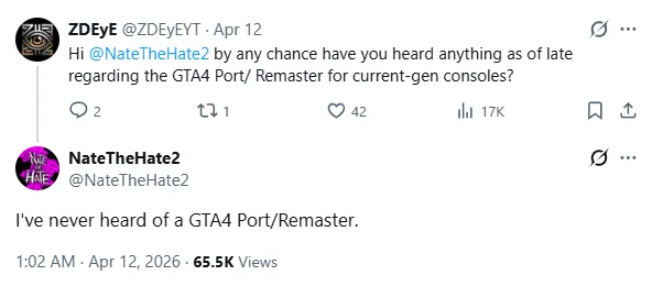 على الصعيد ذاته، هناك مصادر أخرى أشارت إلى أن ريماستر GTA 4 قد يكون حقيقيًا، المسرب Tez2 المعروف بنشاطه داخل مجتمع GTA، سبق وأن ذكر أن هناك نسخة محدثة قيد العمل بالفعل منذ فترة، وقد يتم إصدارها على شكل نسخة مسّنة بسيطة، شبيهة بما حدث مع Red Dead Redemption عند إطلاقها على منصات أحدث، دون تغييرات جذرية في الرسوميات أو أسلوب اللعب.