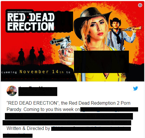 لكن ما نود التحذير منه, هو “البوستر” الخاص بالفيلم الإباحي و الذي يشبه تماما البوستر الخاص بلعبة Red Dead Redemption 2 بكل تفاصيله حتى عنوان اللعبة اقتبس في الفيلم الإباحي و لم يسلم منه, و البوستر طبعا نقصد فيها اللوحة أو المادة الإعلانية, سنترككم مع هذه الصورة بغرض التحذير فقط لا أكثر و بعدها نستقبل آرائكم حول هذا الخبر أدناه.