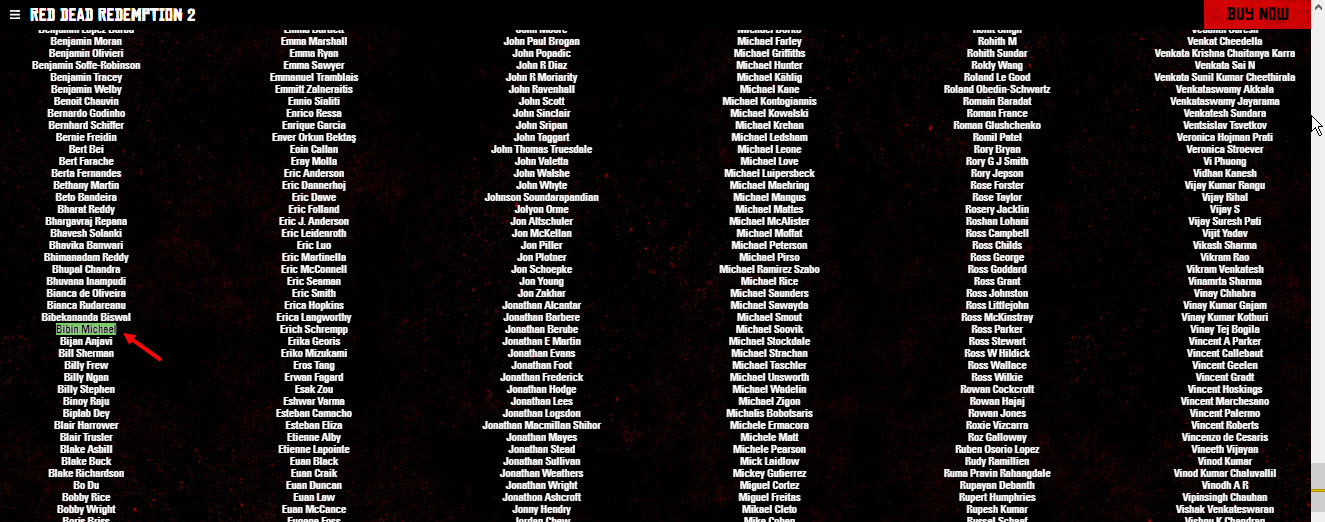 حسنا دعونا في البدايا نتأكد من هو بيبين مايكل و كان علينا التأكد انه بالفعل عمل لدى استيديوهات روكستار كما يدعي و عندما توجهنا الى موقع روكستار على الانترنت و البحث بين اسماء المطورين و من خلال صفحة الشكر التي وضعتها روكستار لجميع المطورين الذين شاركوا في تطوير لعبة Red Dead Redemption 2 و كان اسم بيبين مايكل من بين الاسماء كما تشاهدون في الصورة بالاسفل.