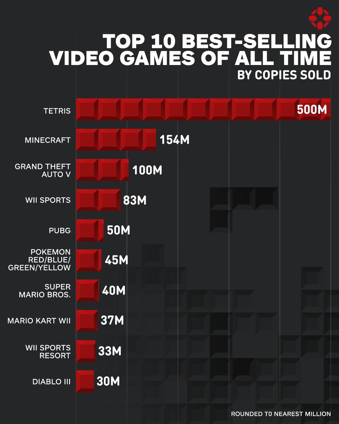 لعبة PUBG أصبحت في المركز الخامس كأكثر منتج ترفيهي مبيعا في التاريخ و تأتينا في الصدارة لعبة Tetris بمبيعات تخطت 500 مليون و لعبة GTA V أصبحت ثالثة الترتيب بمبيعات وصلت إلى 100 مليون نسخة اما لعبة PUBG و هي الخامسة في سلم الترتيب قد وصلت مبيعاتها إلى الرقم 50 مليون كما تشاهدون الصورة أدناه.